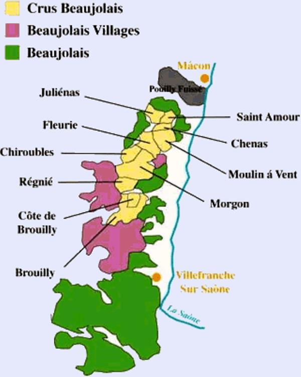 Vīns nāk no 10 īpašām teritorijām, kuras minētas kartē kā Beaujolais Cru. Vīni izcili un var būt ilgstoši izturēti.