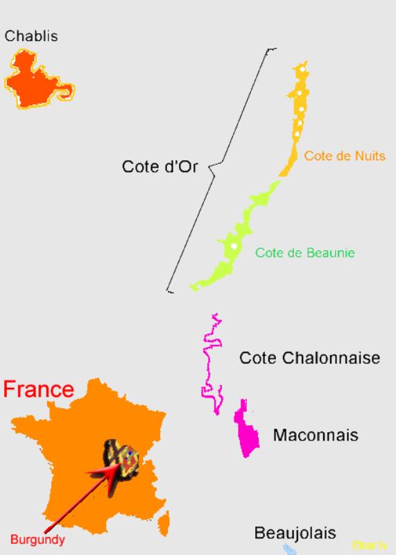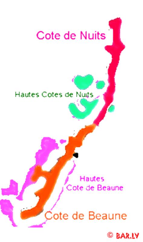 Cote d’Or apgabals tiek sadalīts divās daļās (rajonos) Cote de Nuits un Cote de Beaune. Savukārt Cote de Nuits rajons iekļauj sevī atsevišķas teritorijas, kuras dēvē par Hautes Cotes de Nuits, bet Cote de Beaune rajons iekļauj sevī atsevišķas teritorijas, kuras dēvē par Hautes Cote de Beaune. Principā sanāk četras dažādas teritorijas ar atšķirīgu augsni, kā rezultātā sanāk atšķirīga rakstura vīni.